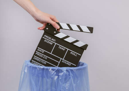 Hand throws movie clapperboard into trash bin with package on gray background