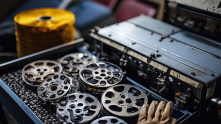 An intimate view of vintage film equipment showcases reels and a projector, evoking nostalgia and highlighting the importance of film preservation and cinematic art in modern culture.