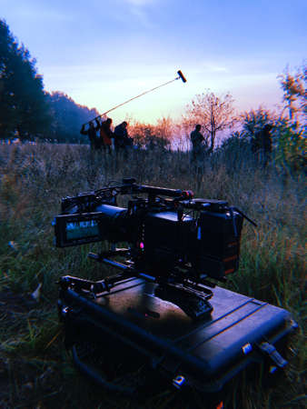 shooting a film at dawn, one camera in standby mode, the second group in force to shoot in the background