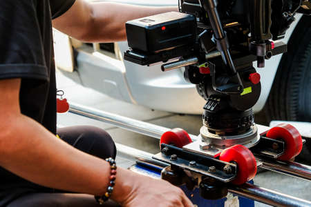 Behind the scenes of filming movies and video products, setting up equipment for shooting video and sound. The concept of producing video content for social networks, TV and blogs