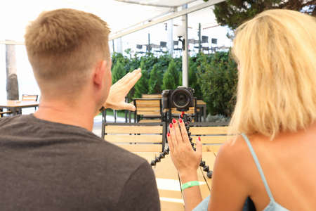 Videographer filming teen models on city. Man using steadicam and camera to make footage. Digital devices for video shoot.