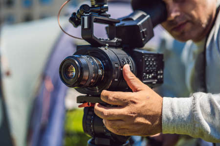 MOSCOW, RUSSIA - JULY 13, 2020. Man operating RED DRAGON professional cinema camera mounted on a tripod