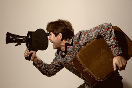 Portrait of a cameraman with old movie camera. Happy traveler with a suitcase on shooting video