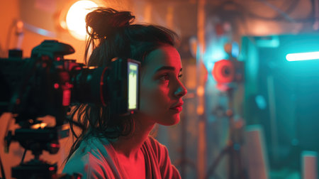 A filmmaker operating a camera in a studio filled with colored smoke and dramatic lighting, creating an artistic and cinematic atmosphere.