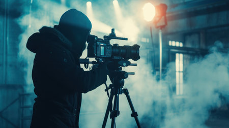 A filmmaker standing with a camera in a dynamic smoke-filled environment, blending artistic and cinematic tones.
