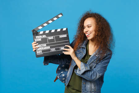 Young african american girl teen student in denim clothes, backpack hold clapper isolated on blue background studio portrait. Education in high school university college concept. Mock up copy space