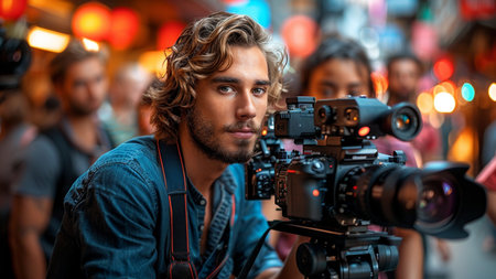 Skilled Man cameraman filming. Cinema tv set. Generate Ai