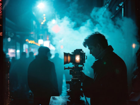 A film crew is captured on a movie set with several figures operating cameras and equipment. The scene exhibits a moody atmosphere with strong lighting and shadows. The composition suggests an interior setting, possibly a soundstage, conducive for filmmaking. Suitable for editorial and commercial applications.