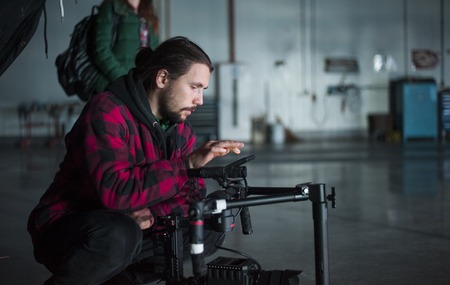 Steadicam operator and his assistant prepare camera and 3-axis stabilizer-gimbal for a commercial shoot.