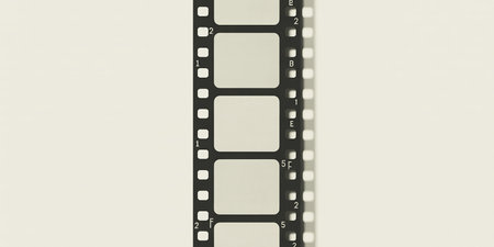 A detailed close-up of a vintage 35mm film strip featuring blank frames and visible perforations against a light background.