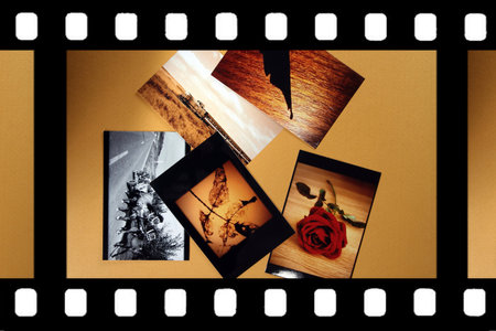 Black and white film strips show nostalgic frames, capturing a retro photography vibe and artistic exploration.