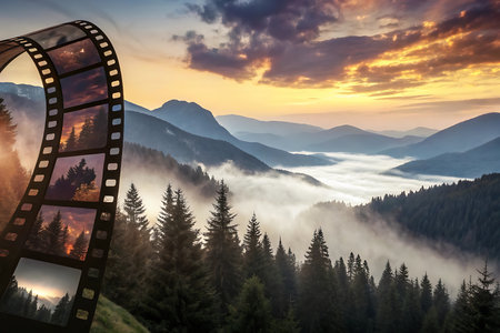 Film strip with various scenic landscapes including mountains, forests, roads, and misty views creating calm and adventurous mood