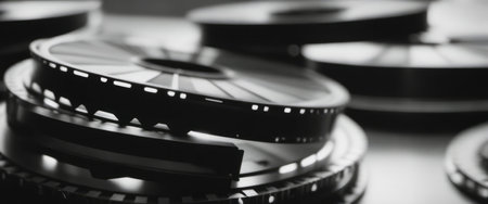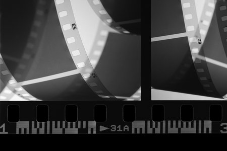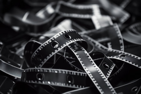 Film strip close-up presenting a black and white negative film, ideal for cinematography and photography concepts.