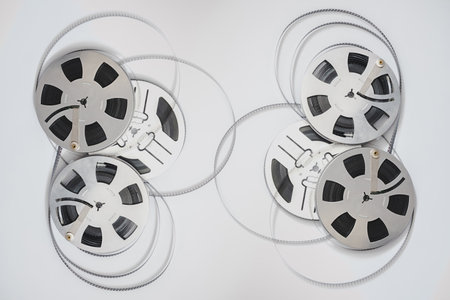Used 35mm film rolls on white background, copy space