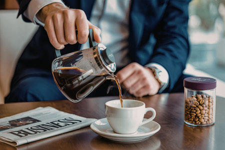 A man in a blue suit is pouring coffee from a glass pot into a white cup on a wooden table, with a newspaper titled 'BUSINESS' and a jar of coffee beans nearby.
