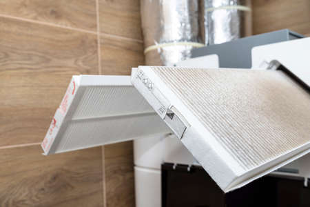 Home mechanical ventilation with heat recovery hanging on the wall, visible dirty G4 filter and clean F7 filter sticking out of the machine.