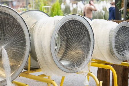 Detailed metal made pipe, crop pouring chute in agricultural machine. Harvesting objects.