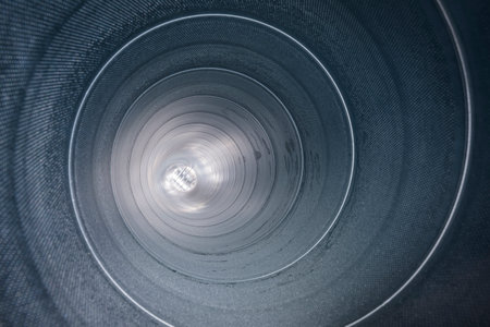 The ventilation pipe is round from the inside. Steel pipes, parts for the construction of industrial air conditioning ducts inside the pipe. Industrial ventilation equipment