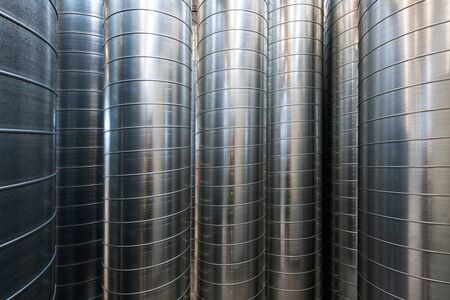 Ventilation pipe warehouse. Steel pipes, parts for the construction of air ducts for an industrial air conditioning system in a warehouse. Industrial airway ventilation equipment and piping systems.