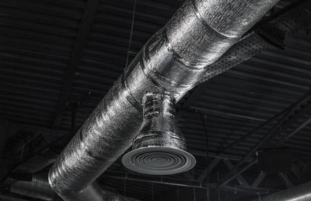 Pipes duct tube hanging from ceiling store inside for conditioner air. Ventilation system in shopping mall.