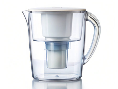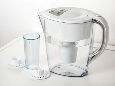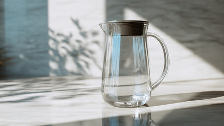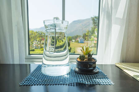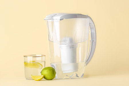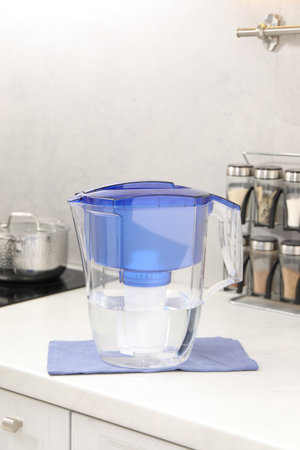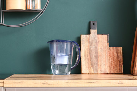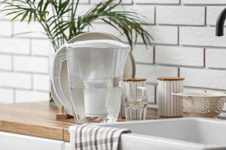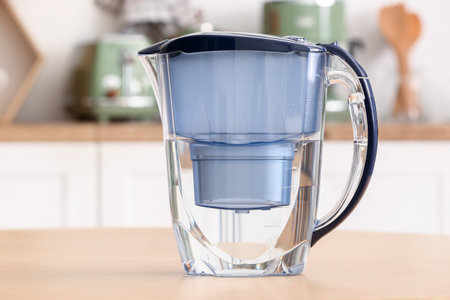Water filter jug on kitchen table. Clean water concept. Filtration water