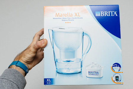 PARIS, FRANCE - DEC 18, 2017: Man holding New Brita Marella XL water filter against white background