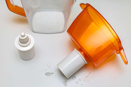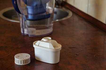 Water filter plastic jug with a new replaceable cartridge. Replaceable module, or cartridge for cleaning tap water
