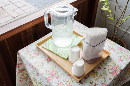 Drinking water, disposable cups and tissue paper for customer at self service corner in the coffee shop