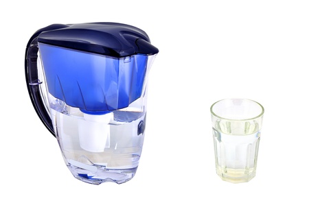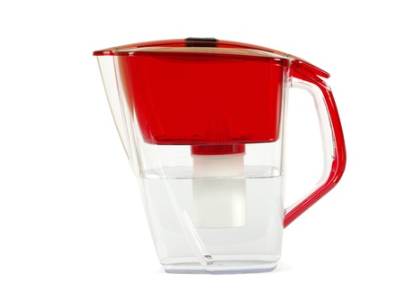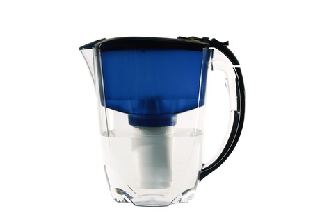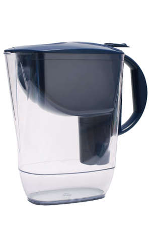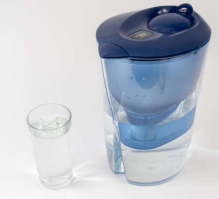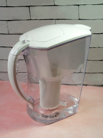 Jug with water filter made of transparent plastic. Drinking water filter.