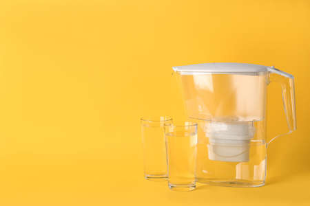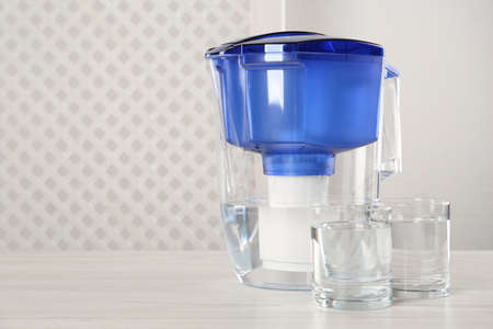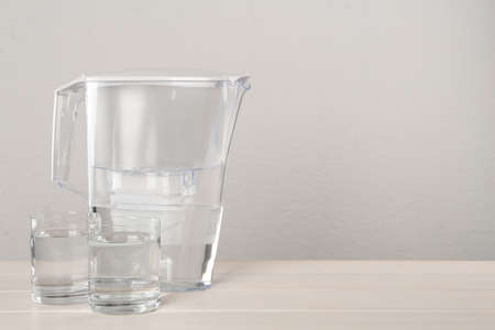 Filter jug and glasses with purified water on white table against light background. Space for text