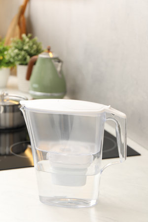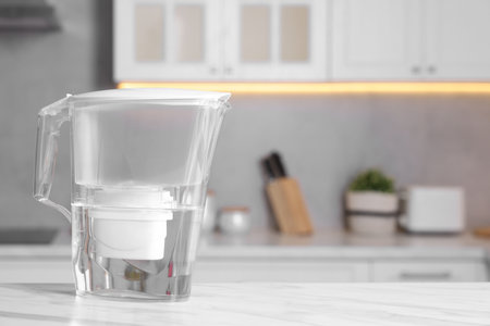 Water filter jug on white marble table in kitchen, closeup. Space for text
