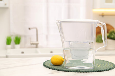 Water filter jug and lemon on white marble table in kitchen, space for text