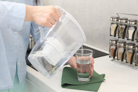 Woman pouring water from filter jug into glass in kitchen, closeup