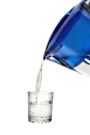 Water is poured into a transparent glass beaker from a jug-filter. Isolated on white background