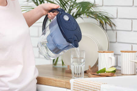 cropped shot of female hand hold pitcher with filter and pouring water from tap at kitchen on wall background with copy space, healthy lifestyle concept