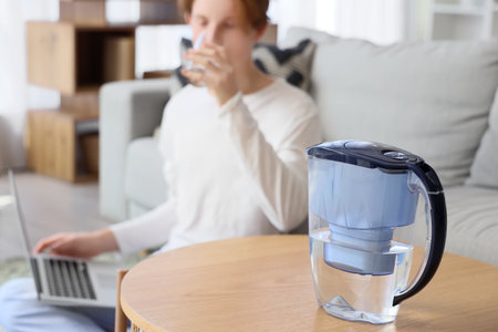 Filter jug on table against young man with laptop drinking water at home, closeup