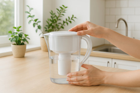 Hands holding water filter jug on wooden kitchen counter near window with green plants. Concept of clean drinking water, home water purification, eco friendly filtration, healthy lifestyle.