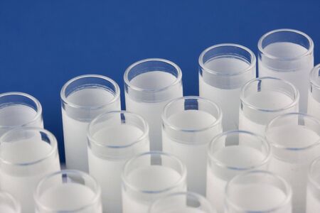 laboratory glass testing tubes with white label rings against blue background