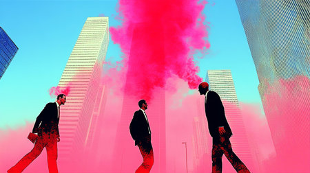 Geometric collage blending stock market elements with vibrant textures surrounding a skyscraper