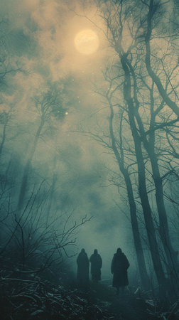 Haunted Forest, Shadowy Figures, Whispering Trees, Mysterious Glowing Orbs, Ominous Silence, Realistic Photography, Backlights, Eerie Glow