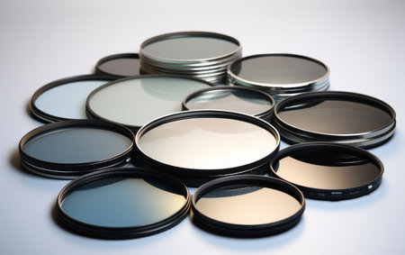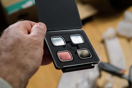 Close up of neutral density filters or ND filters and polarising filters set for drone. Filters for the drone camera.