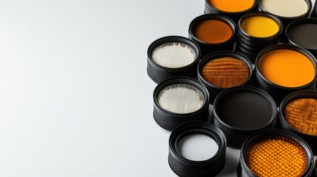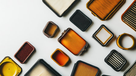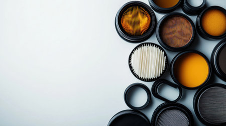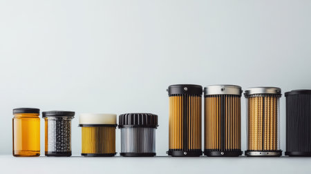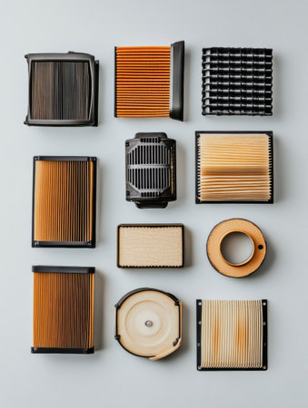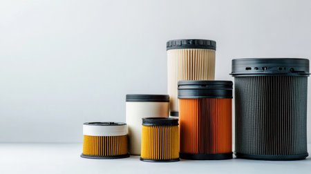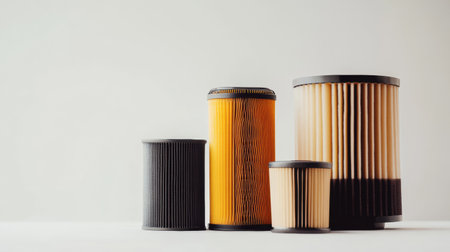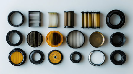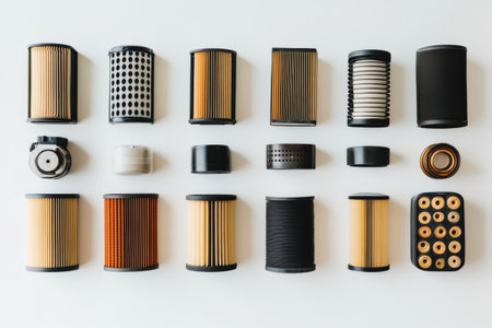 Showcase of various car filters (oil, air, fuel) displayed neatly on a light background, emphasizing their vehicle importance.