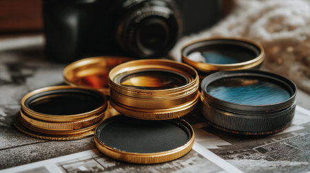 A captivating arrangement of camera filters and lenses displayed on vintage photography prints, accompanied by a DSLR camera, showcasing creativity and passion for photography.