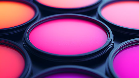 Bright, circular paint pans with neon colors such as vibrant pink and orange arranged in a close up. The background is solid, creating a lively atmosphere reminiscent of creativity.