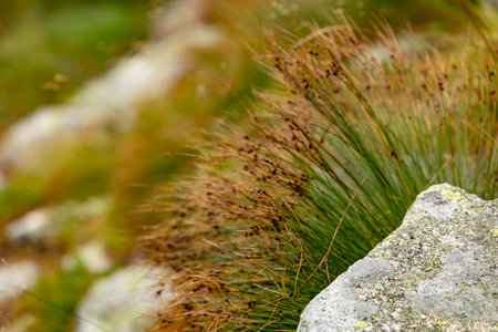 Close-up of wild grass and lichen-covered rock in a natural outdoor environment with soft focus.