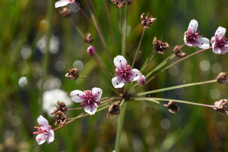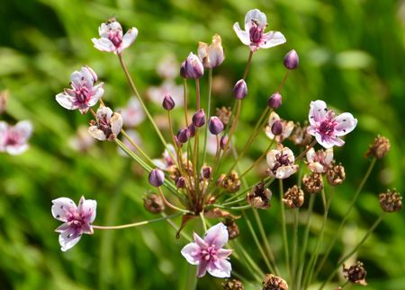 Swan flower, Butomus umbellatus, is a frog-shaped aquatic plant with pink flowers.