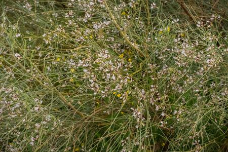 Retama raetam. Field of white wildflowers in Israel. Flower background