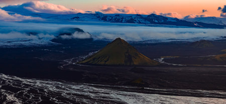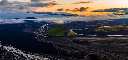 Aerial View of Icelandic Volcanic Terrain at Sunset with Glacial Rivers
