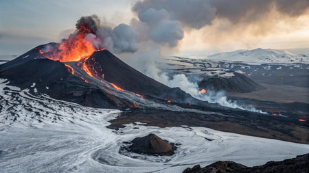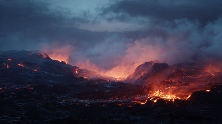 Stunning eruption of a volcano, showcasing fiery lava and plumes of smoke against a twilight sky.