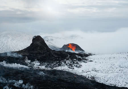 Iceland Volcanic eruption 2021. The volcano Fagradalsfjall is located in the valley Geldingadalir close to Grindavik and Reykjavik. Hot lava and magma coming out of the crater.